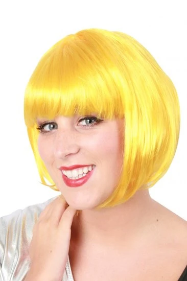 Damespruik kort bobline model in de kleur geel. De pruik komt in een one size en heeft een elastiek waardoor het elke volwassenen past! Deze pruik heeft kort haar, is een bobline model en bestaat uit kunsthaar. Dit model komt in verschillende kleuren waardoor er altijd wel iets voor jou bij zit! Met deze pruik is je oufit helemaal compleet!