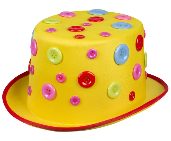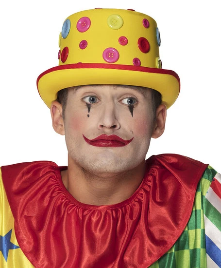 Clownshoed geel met gekleurde knopen in verschillende groottes. One size hoed is gelijk aan standaard maat 58.