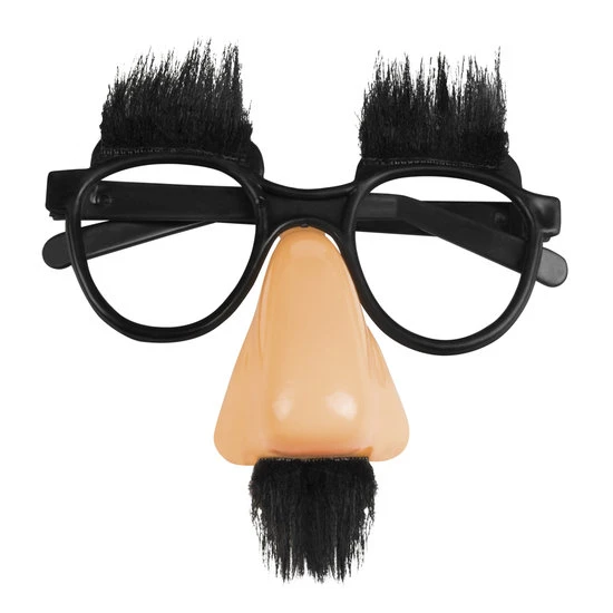 Plastic brilletje zonder glazen, maar met neus, snorretje en wenkbrauwen. Een bril om anoniem te blijven!