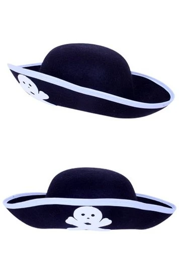 Mooie piratenhoed voor kinderen in de kleur zwart. De hoed is afgebeeld met een doodshoofd in het wit en valt als een kindermaat hoed. Leuk om bij een kostuum te dragen tijdens een thema feestje! Met deze hoed ben jij net een echte kapitein!Â