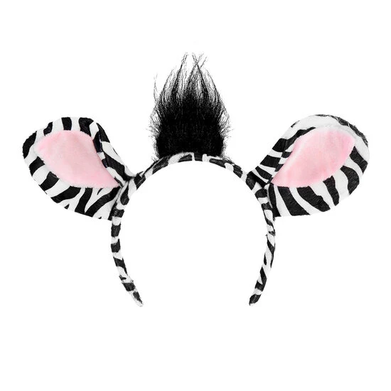 Zebra set in de kleuren zwart-wit 2-delig. De set bestaat uit oortjes op diadeem en een zebra staart. Het setje is van zacht materiaal en is perfect voor een dierenthema of carnaval!