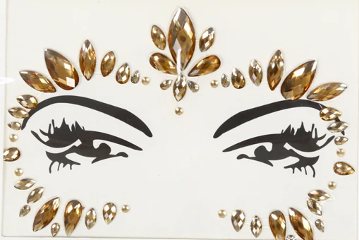 Goude lichaam en gezicht steentjes. De steentjes zitten op een sticker, die gemaakt is voor eenmalig gebruik. Haal de stickers voorzichtig van de huid en gebruik wimperlijm om deze stickers te herbruiken. Set van 27 stickers bestaand uit druppels en rondjes. Aanbrengen op een droge huid.