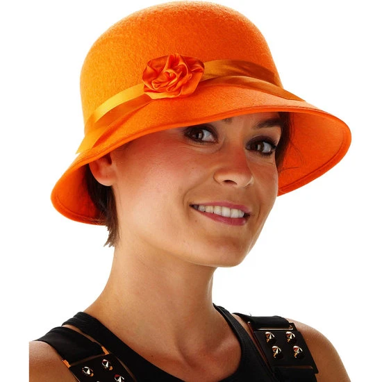 - Deze oranje hoed model Beatrix heeft een oranje rozet.