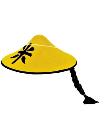 - Chinese hoed geel met zwarte tekens. Inclusief bevestigde zwarte vlecht!
