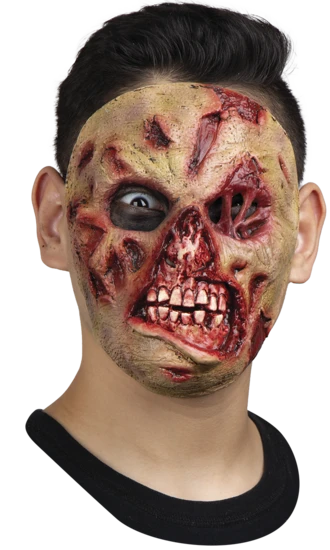 Gezichtsmasker van een zombie. Het masker bedekt de voorklant van het gezicht en heeft een open achterkant. Verder is het masker uitgerust met een zwarte elastische band, waardoor het masker goed voor je hoofd blijft zitten. Het maske ris gemaakt van natuurlijk latex rubber en komt uit de Ghoulish Productions collectie! Met dit masker ben jij helemaal klaar voor halloween!