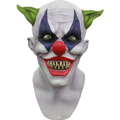 Masker Creepy Giggles. De ogen van dit ‘Joker’ masker lijken net echt. Het masker heeft een halsstuk, waardoor een deel van de hals bedenkt is. De kijkgaten zitten bij de ogen.