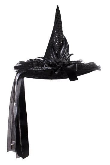 Heksenhoed zwart met glans. De heksenhoed is van satijn wat het een sierlijke uitstraling geeft. De heksenhoed is afgewerkt met diverse zwarte veren en andere patronen. De heksenhoed is een one size volwassen maat. Leuke heksenhoed voor decoratie of gebruik!Â