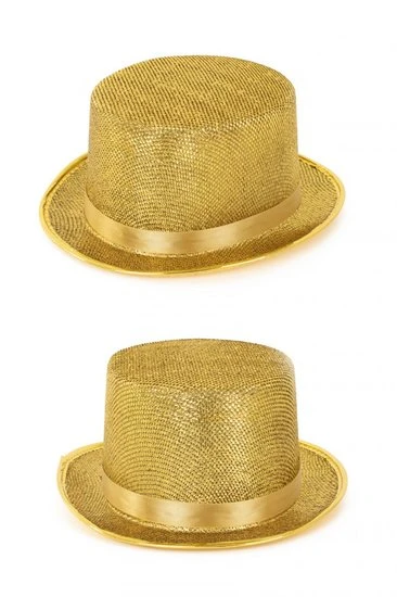 Hoge hoed lurex goud met zilver lint. Heeft een glinsterend effect! Gemaakt van vilt en van stevige kwaliteit. Deze hoed heeft een hoogte van 12 cm en een omvang van ongeveer 59 cm ( volwassen maat ). Met deze hoed maak je je oufit helemaal compleet!
