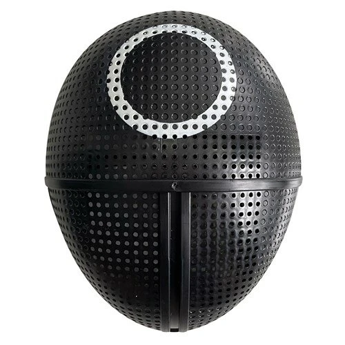 Plastic gezichtsmasker in de kleur zwart met een wit rond logo afgebeeld. Het masker is voorzien van een elastiek dat achter je hoofd kan. Met dit masker ben jij klaar voor halloween, carnaval of een ander feestje!