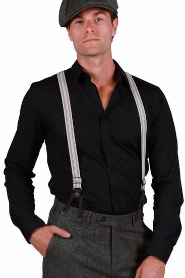 Bretels in de stijl van 1920, ecru-bruin luxe. De bretel is gemakkelijk te verstelbaar en zijn voorzien van elastische banden met Knoopsgaten en broek clips. De bretels zijn ongeveer 3 cm breed en bestaat uit polyester en metaal. Met deze luxe stijlvolle bretels maak jij je peaky blinders oufit helemaal compleet!