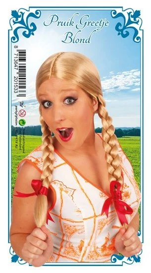 - Damespruik blond met vlechten en rood strikje.