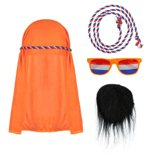 Sheik set Holland 4 delig bestaand uit: hoofddoek, koord, bril en sik. Met dit setje ben jij al helemaal klaar voor elk thema feestje! Alles komt in een one size volwassen maat en kan eventueel met het touw straker worden gezet. Het sikje plakt één malig en kan met mastix meedere keren worden gebruikt.