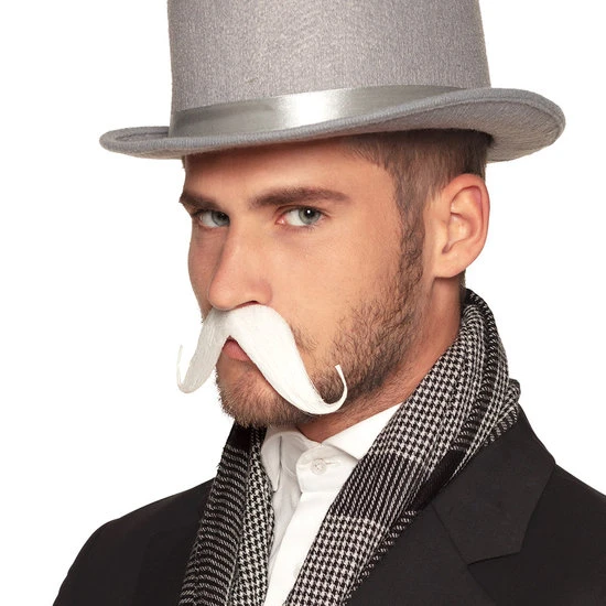 Snor graaf in de kleur wit. De snor is zelfklevend, van goede kwaliteit en gemaakt voor eenmalig gebruik. Haal de snor voorzichtig van de huid en gebruik huidlijm om deze te herbruiken. Mocht je de snor lang gebruiken kan het zijn dat deze langszaam loslaat door transpiratie. Gebruik in dat geval dan ook huidlijm.