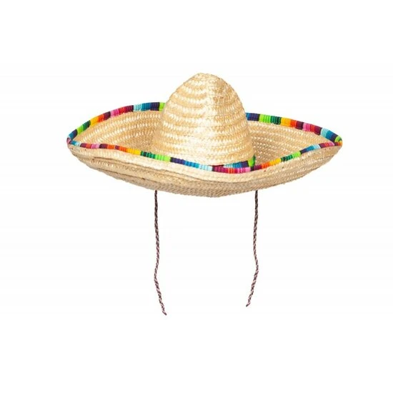 Sombrero beige van stro met een gekleurde rand. De sombrero heeft een pasmaat van c.a. 57 cm. De sombrero is c.a. 45 x 45 x 20 cm. Maak je Mexicaanse outfit nu helemaal compleet met deze sombrero. De sombrero heeft een touwtje, waarmee je deze gemakkelijk vast kunt zetten.