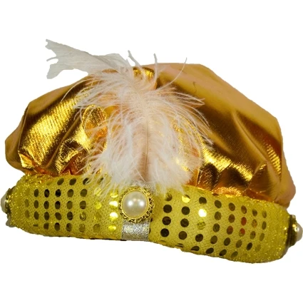 - Gouden sultanhoed met glitters, witte parels en één veer (volwassen maat).