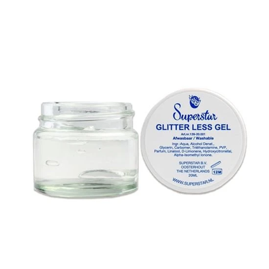 Glitter less gel pot 15 ml. Met deze gel kunt u cosmetische glitters mengen en zo uw favoriete kleur creëren. Deze kan zowel op de huid als tip-creme als op het haar gebruikt worden. Te verwijderen met water en zeep.
