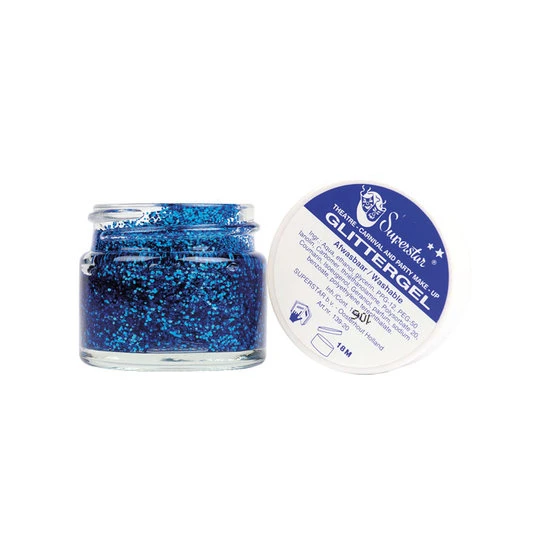 Glittergel blauw pot 15 ml. Geeft zowel als tipcreme op de huid, als haargel fraaie glittereffecten. Functioneert heel goed als setting-gel. Bij gebruik op gezicht niet te dicht bij de ogen. Waterafwasbaar.