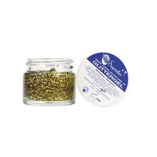 Glittergel goud pot 15 ml. Geeft zowel als tipcreme op de huid, als haargel fraaie glittereffecten. Functioneert heel goed als setting-gel. Bij gebruik op gezicht niet te dicht bij de ogen. Waterafwasbaar.