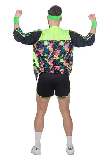 Trainingspak in de kleuren zwart-groen in verschillende maten voor heren. Het kostuum bestaat uit een jack met korte broek. Leuk jaren 80 disco outfit voor heren tijdens carnaval of een ander feestje! Het jack heeft een rits aan de voorzijde en is voorzien van 2 steekzakken.